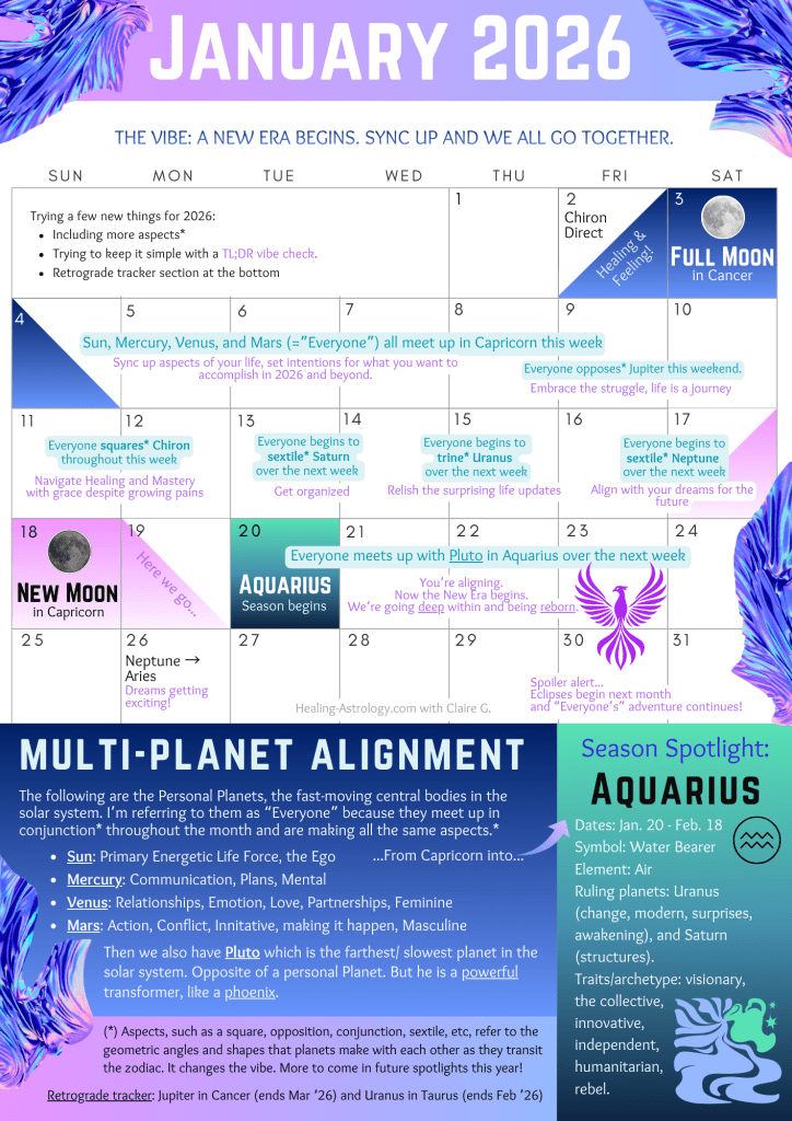 Pluto is basically the opposite of a personal planet because he’s the farthest from the sun so he is very slow. They will pass him one by one, but make a strong connection. Pluto is the God of the Underworld, the Great Transformer, extremely powerful, all about our depths, the shadow territory, and rebirth! Over the past few years Pluto has done a number of retrogrades before finally going direct here in Aquarius, and is feeling fresh and ready to go. Major emphasis this time around on REBIRTH! New year, new us! New cycles for all the personal planets, so new cycles in our lives as well.